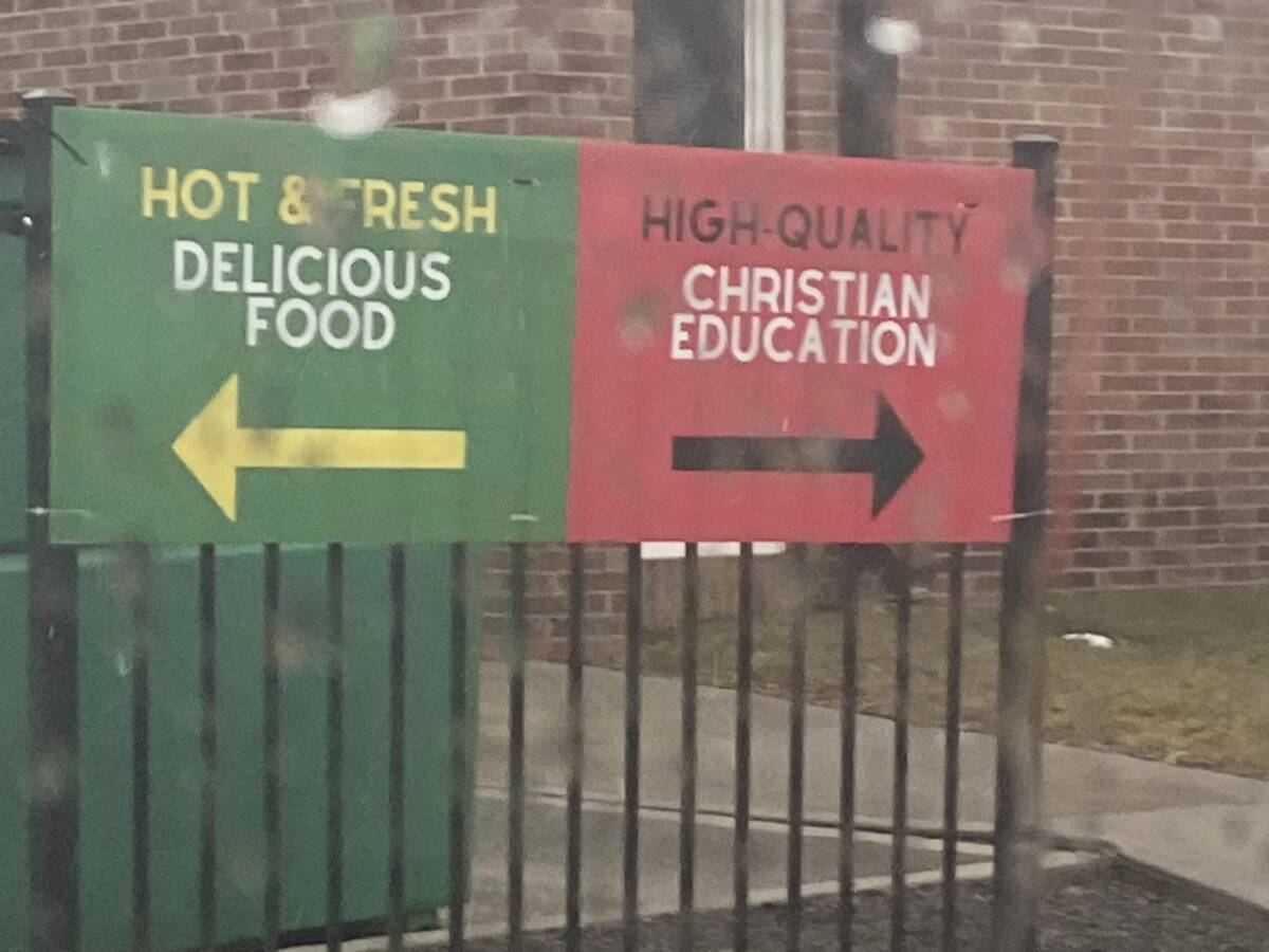 Nothing like giving folks some real options: walk left for a snack, right for some schooling. If only all life’s choices were painted this clearly. Now, am I supposed to learn while I eat, or choose between enlightenment and lunch? I could be convinced either way.
