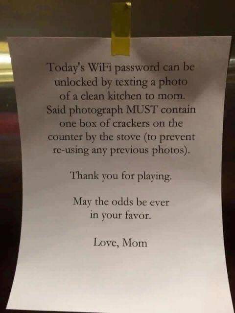 That is some expert-level WiFi password parenting. If you want online access, you gotta earn it—cleaning and all. Extra points for creativity and for making sure there’s no cheating with old photos. May the cleanest kitchen—and fastest texter—win!