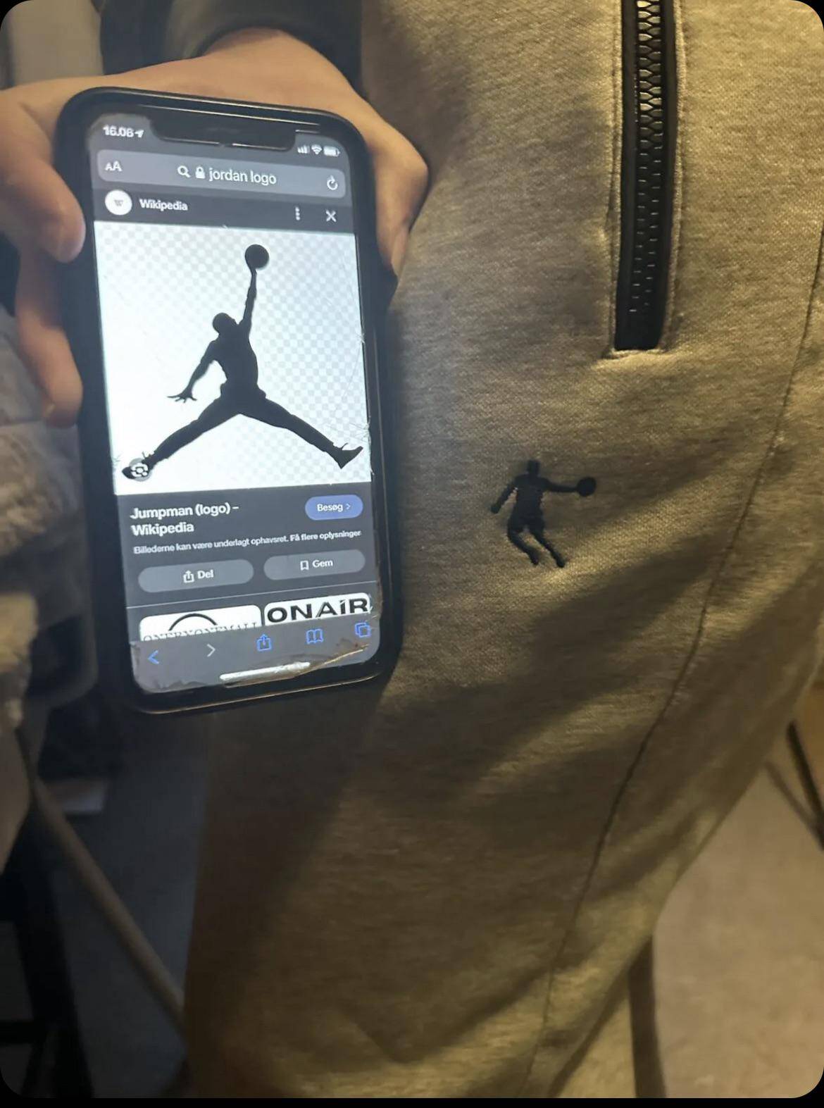 Love that you can tell instantly which logo is aspirational and which one was…inspired. When mom says ‘Jordan,’ but your sweatpants say, ‘Player with Ball.’ 10/10 for effort, and hey, at least the pants look comfy. Sometimes you have to laugh and just own the off-brand style.