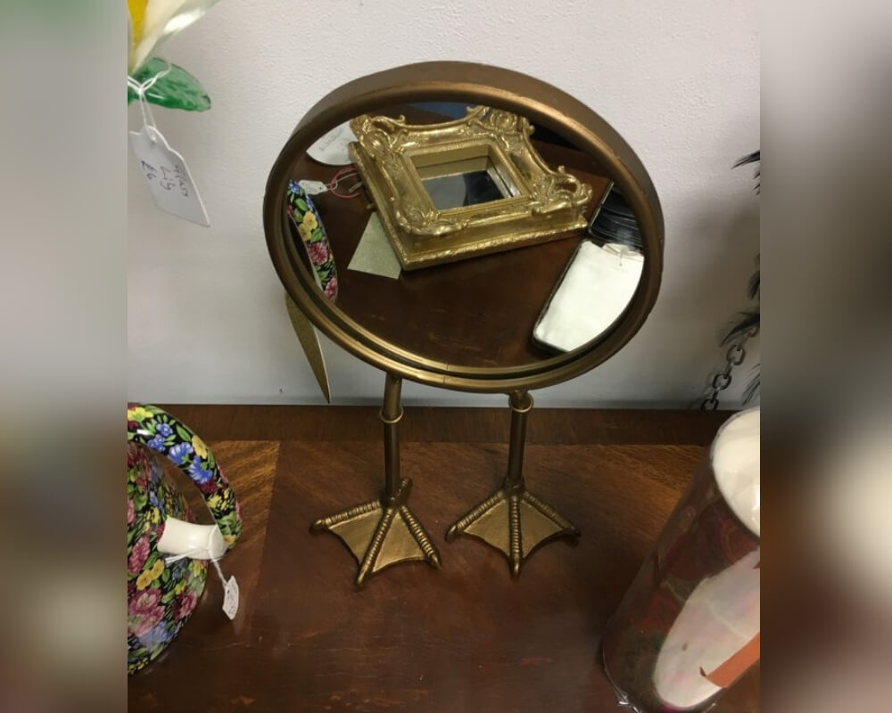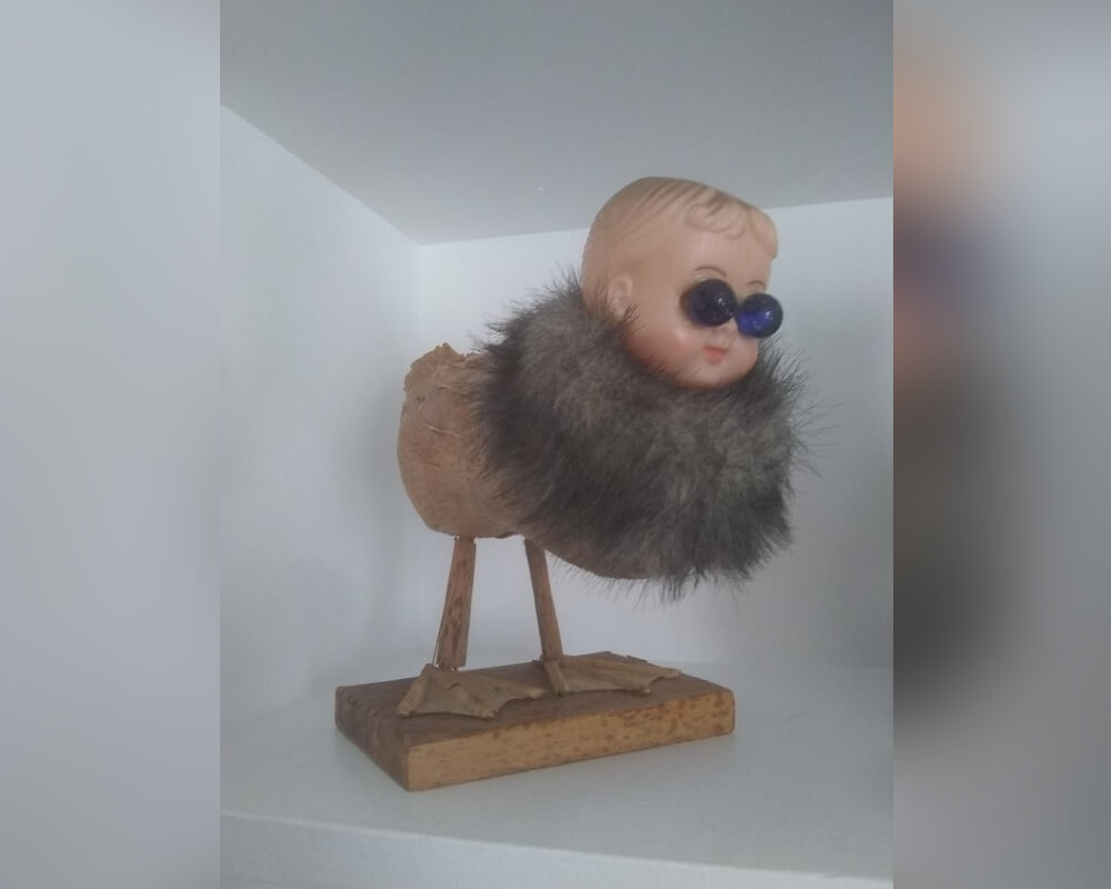 This piece has everything a good weird garage sale item should have. It has feet, it has bird feet, it has a creepy baby head, and it’s old.