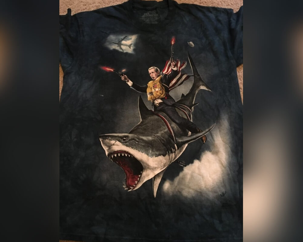 This thrift store t-shirt is pretty amazing if you ask me. I’m not sure how the shark is still alive if it’s all sliced up, but I guess it’s just a really strong shark.