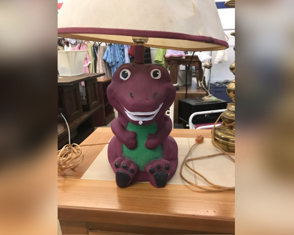 This Barney lamp looks like it’s seen some things— some pretty disturbing things. This lamp is hand painted, and it’s only five dollars. What a bargain.