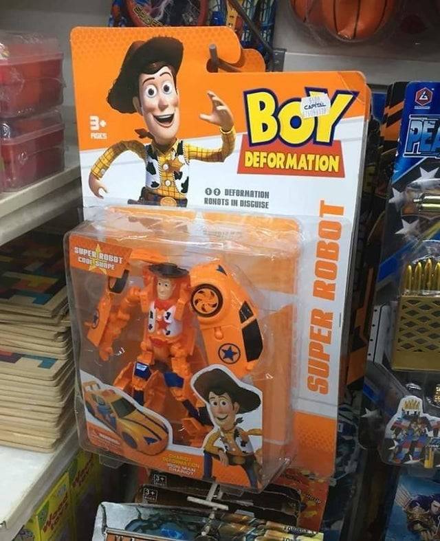 We have seen all of the movies and cannot think of a movie where Woody becomes a transforming car robot, can you?