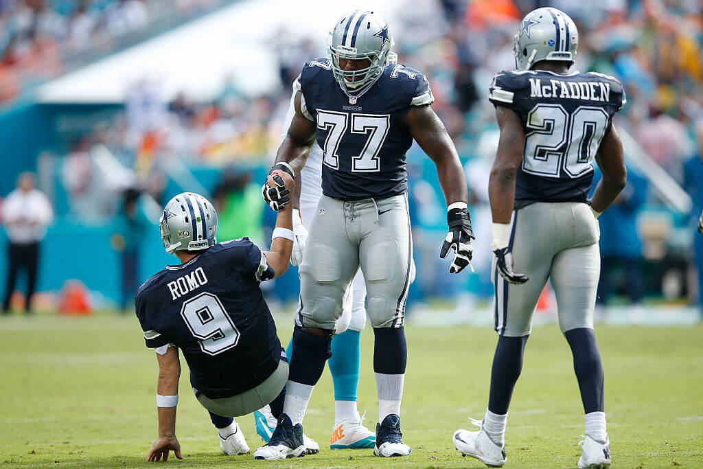 This USC product stands at 6’5″ with a weight of 312 pounds. Tyron Smith, (number 77 who you see helping up Tony Romo) was arguably the best blindside offensive lineman in the NFL. Defensive linemen had to exert all of their efforts trying to get past Smith.