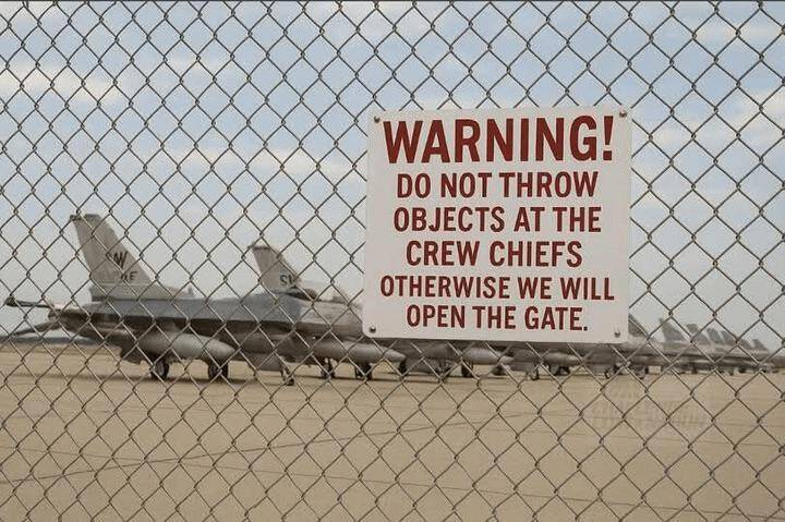 This is the most specific warning I’ve ever seen. If anyone’s out there plotting to throw objects at crew chiefs, you’ve been warned! The threat to open the gate just raises the ante.