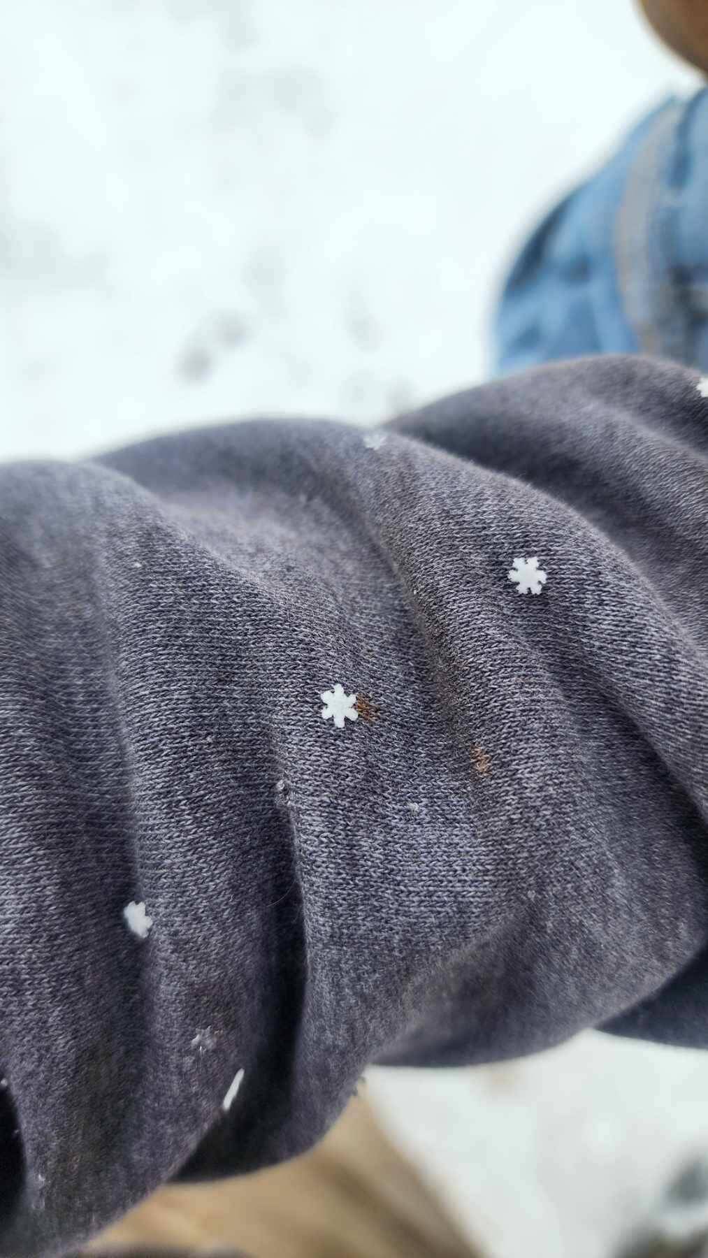 Are you seeing these snowflakes? They’re like tiny, perfect stars! Usually, snowflakes just look like wet blobs, but these are storybook quality. Nature really outdid itself. I want to frame one. Or at least show everyone around me. Winter magic right on my sleeve.