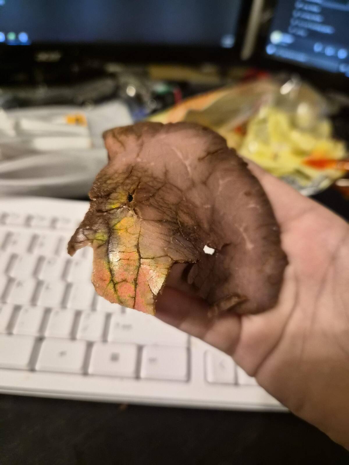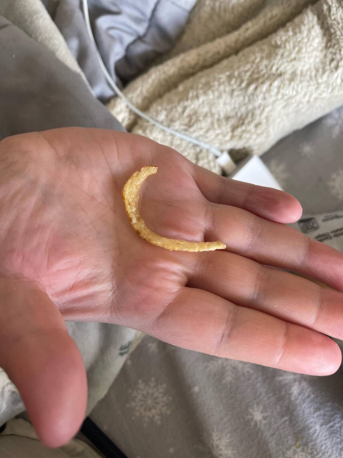 Is this the crescent moon, or did my snack just level up in weirdness? Finding strangely shaped potato chips is nature’s way of keeping snack time exciting. I kind of want to frame it before I eat it.