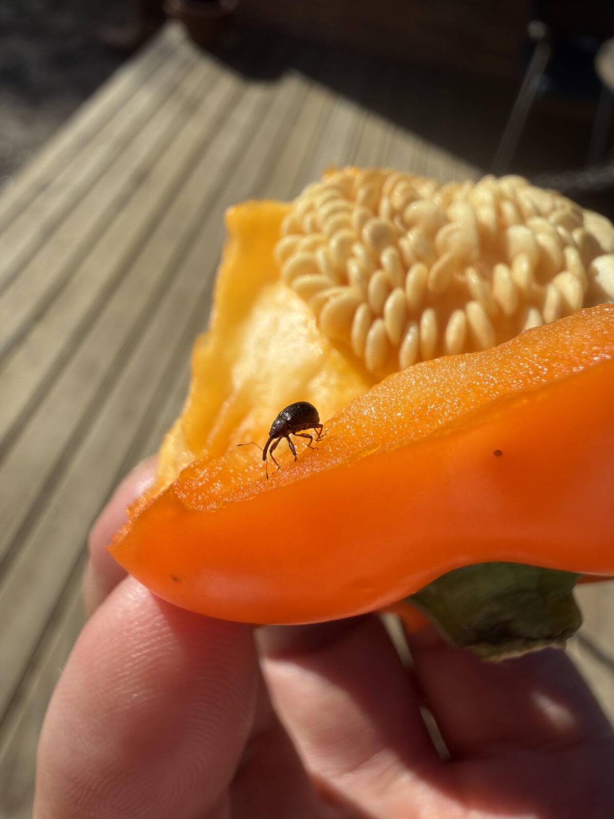 Excuse me, why is there an unexpected guest in my bell pepper? This is NOT the kind of protein boost I asked for. At least the little weevil looks right at home. Still, salad is cancelled for today.