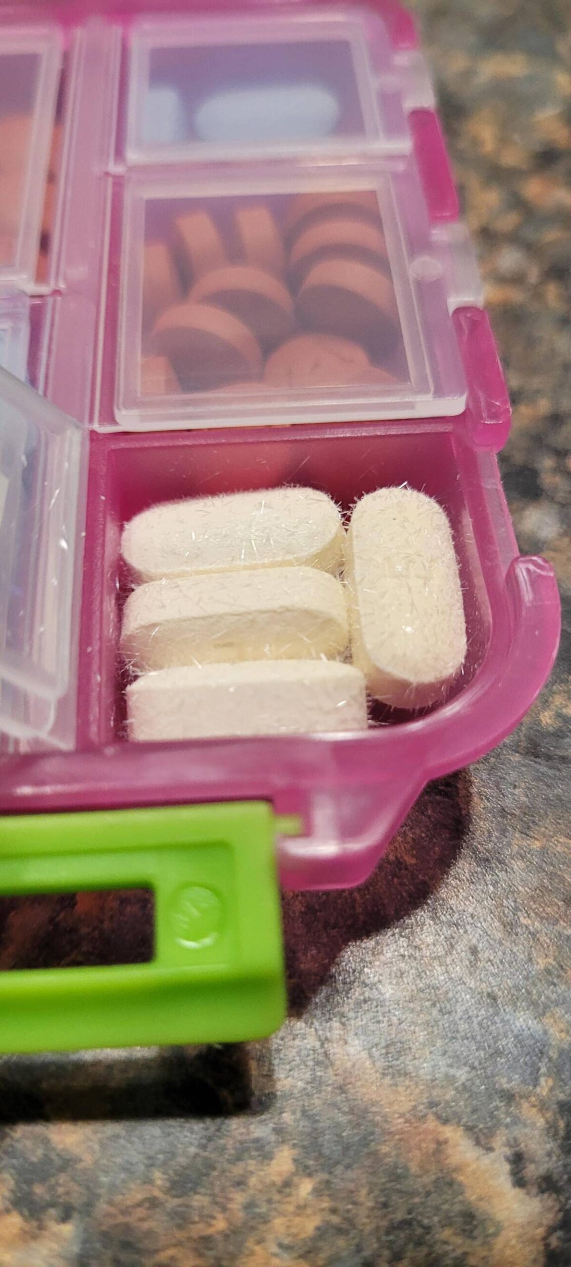 Um, I don’t remember ordering gourmet snow-dusted Excedrin tablets. These pills look like they survived a tiny blizzard inside their own case. Is this a chemistry experiment gone rogue or do I just need to clean out my pill organizer more often?