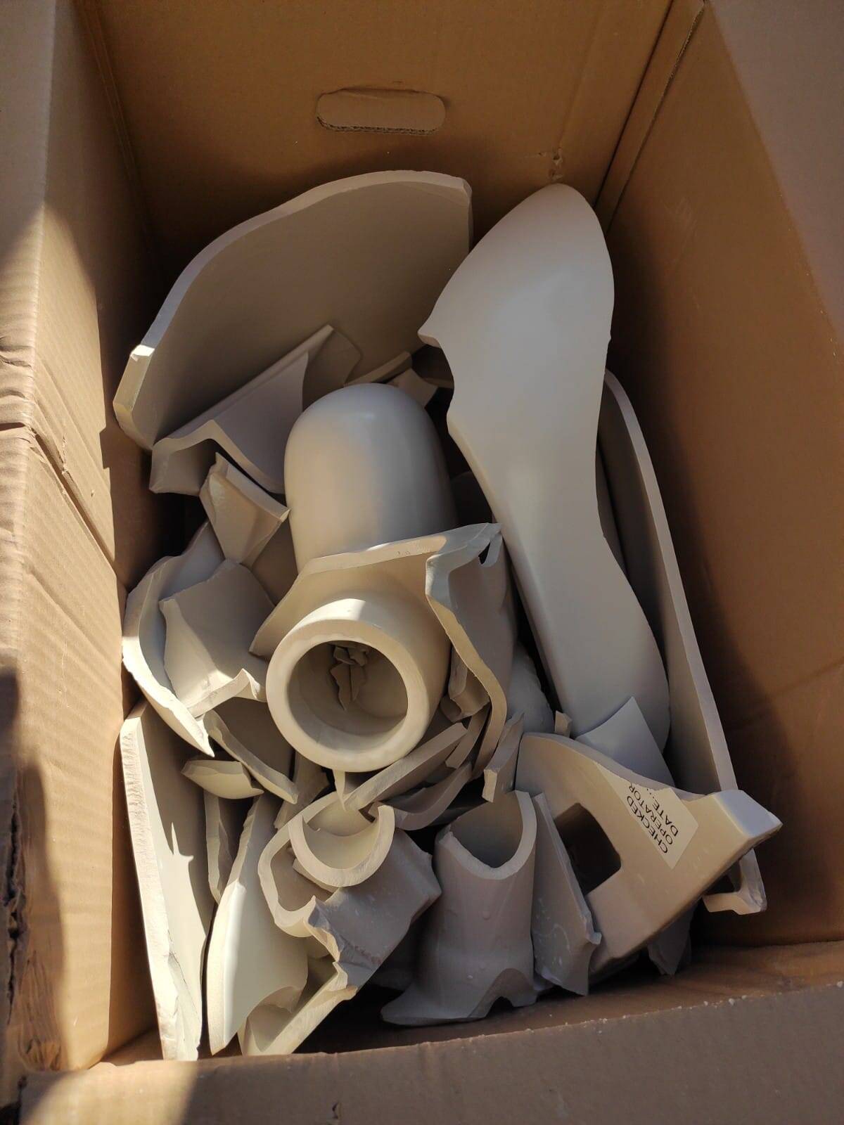 Six weeks of anticipation, and when the prized toilet finally arrives… it’s served as modern art instead. “Some assembly required” really doesn’t cover it. Guess the client will have to keep holding it a little longer. Porcelain dreams, shattered.