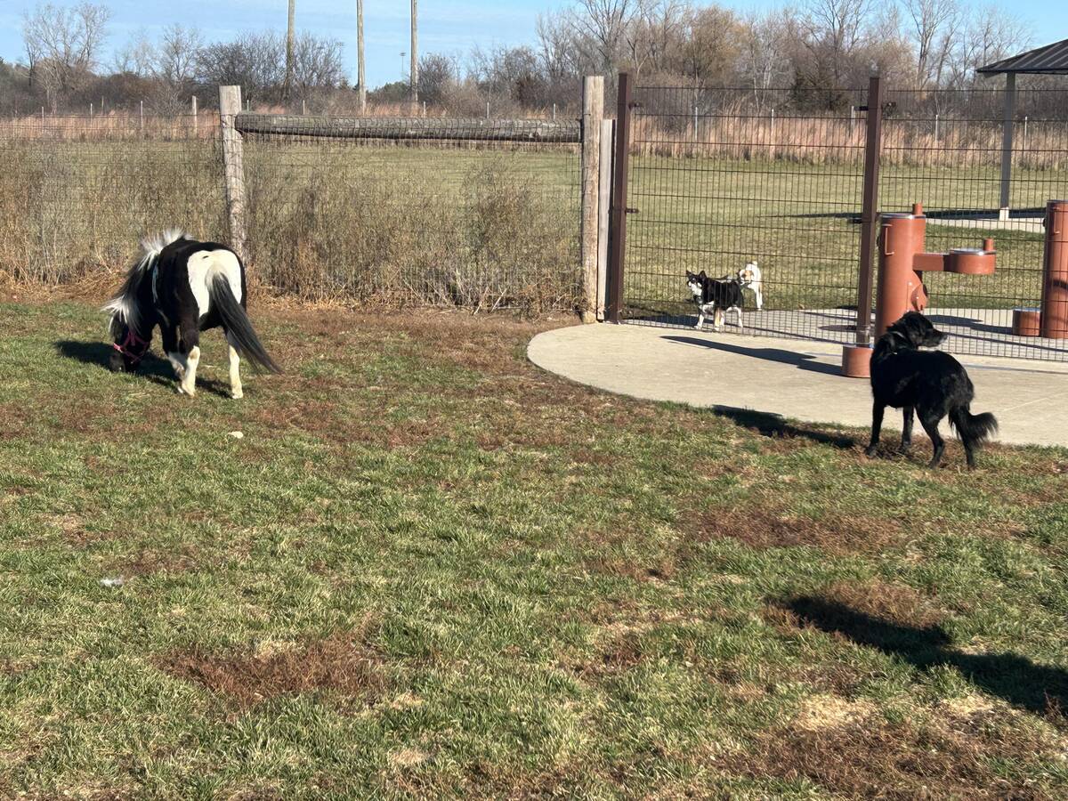 Nothing ruins your sense of dog-park normalcy like seeing a miniature pony casually grazing next to the retrievers. The dogs definitely look confused—is this a really weird-looking hound or just a new level unlocked?