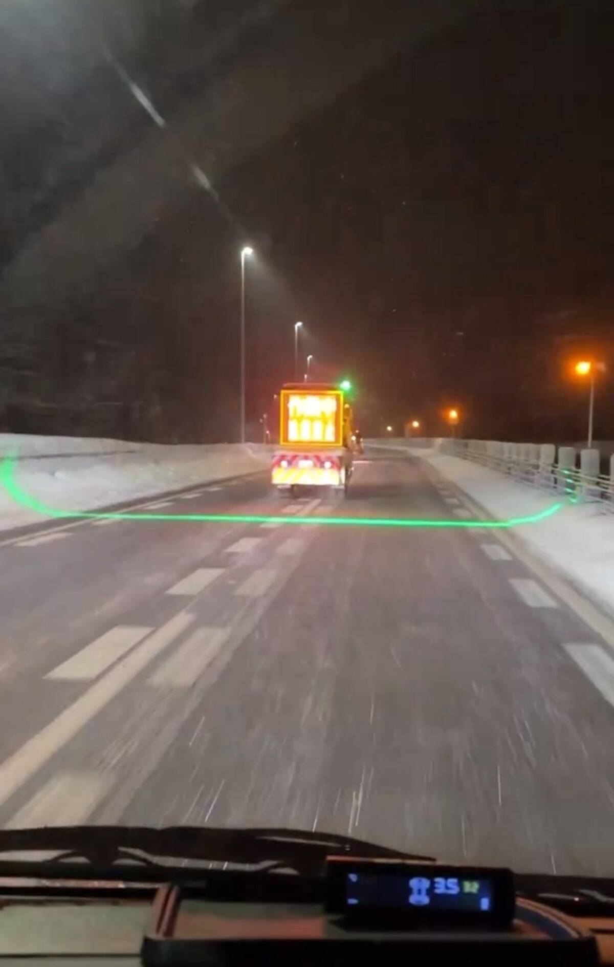 That green laser line feels straight out of a racing video game—except it’s real life and just wants you to drive responsibly. Every road needs a little sci-fi drama, but hopefully, no one tries to leap across that as if it’s a finish line.