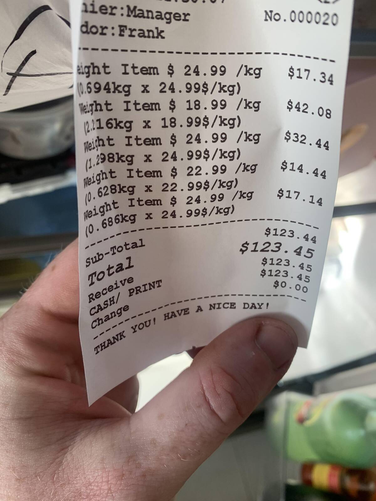 How satisfying is this total? It’s the butcher’s version of hitting the jackpot: $123.45. Bet it’s tempting to buy just a little extra, hoping to land one of these magical receipt numbers again.