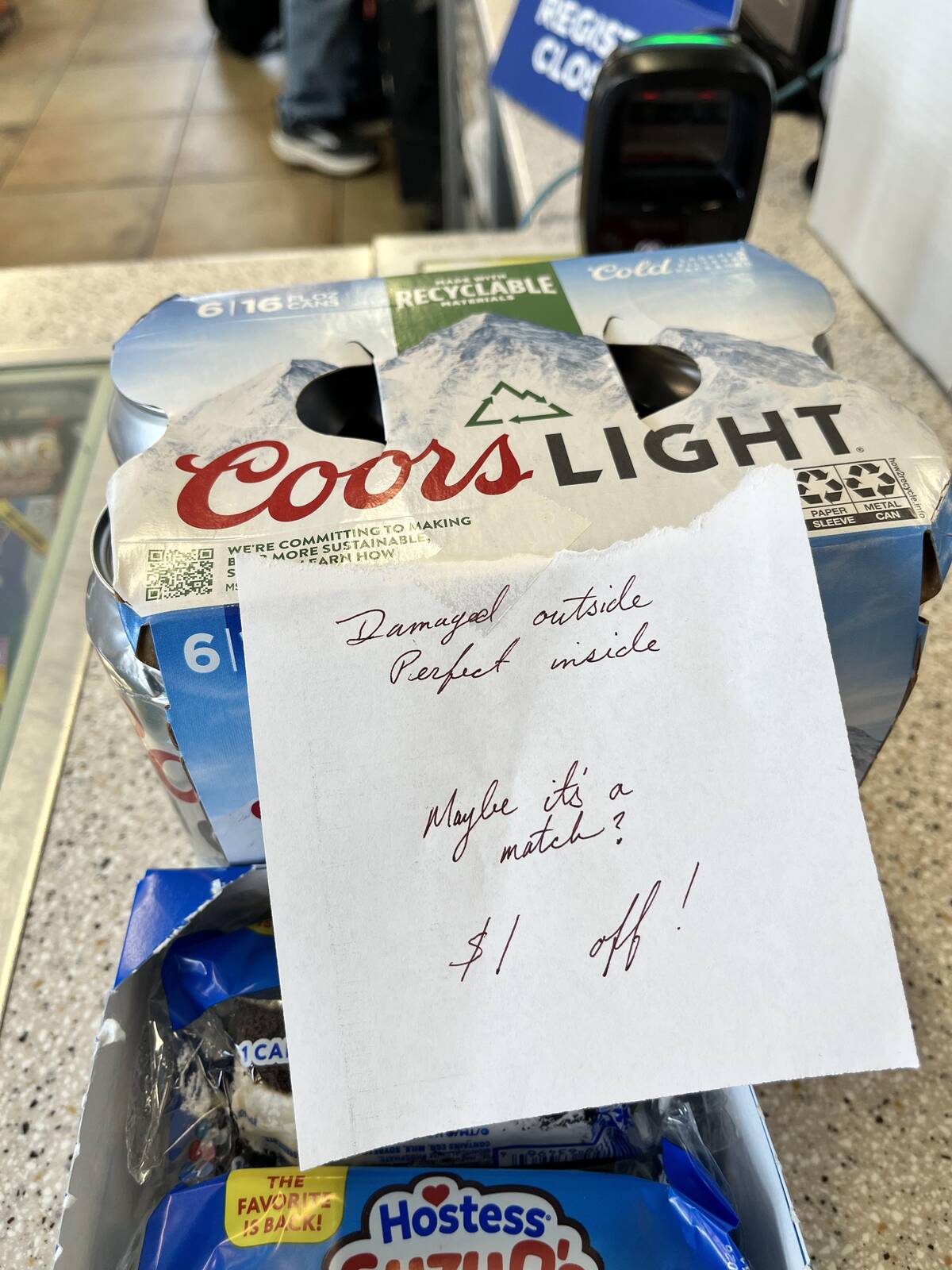 That’s some top-tier convenience store customer service. Damaged outside, perfect inside – just like people! I appreciate the handwritten note – and a discount? That’s taking care of your regulars with a wink.