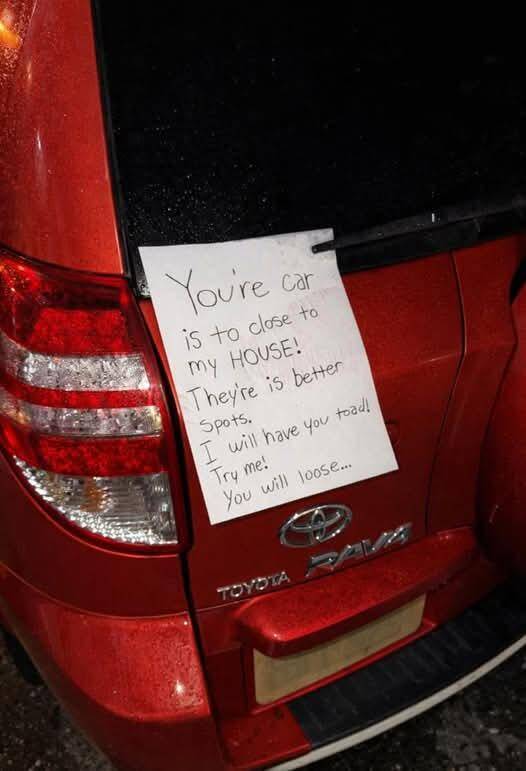 This parking drama has everything: grammar chaos, threats, and a touch of Shakespearean rivalry. Neighbors at war, but with notes. ‘You will loose…’ is both a warning and a promise that spelling will not survive this standoff.