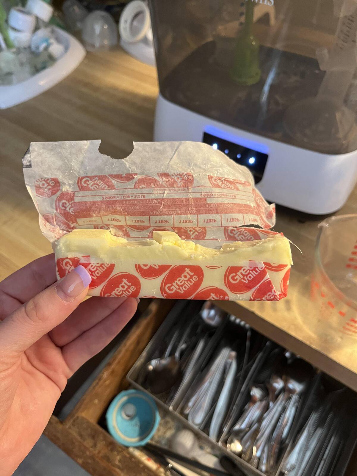 This stick of butter deserved better. Who even slices it like that? I just wanted to make some toast, not contemplate human chaos. Now every time I open the fridge, I’m reminded that some people live with pure, unhinged energy.