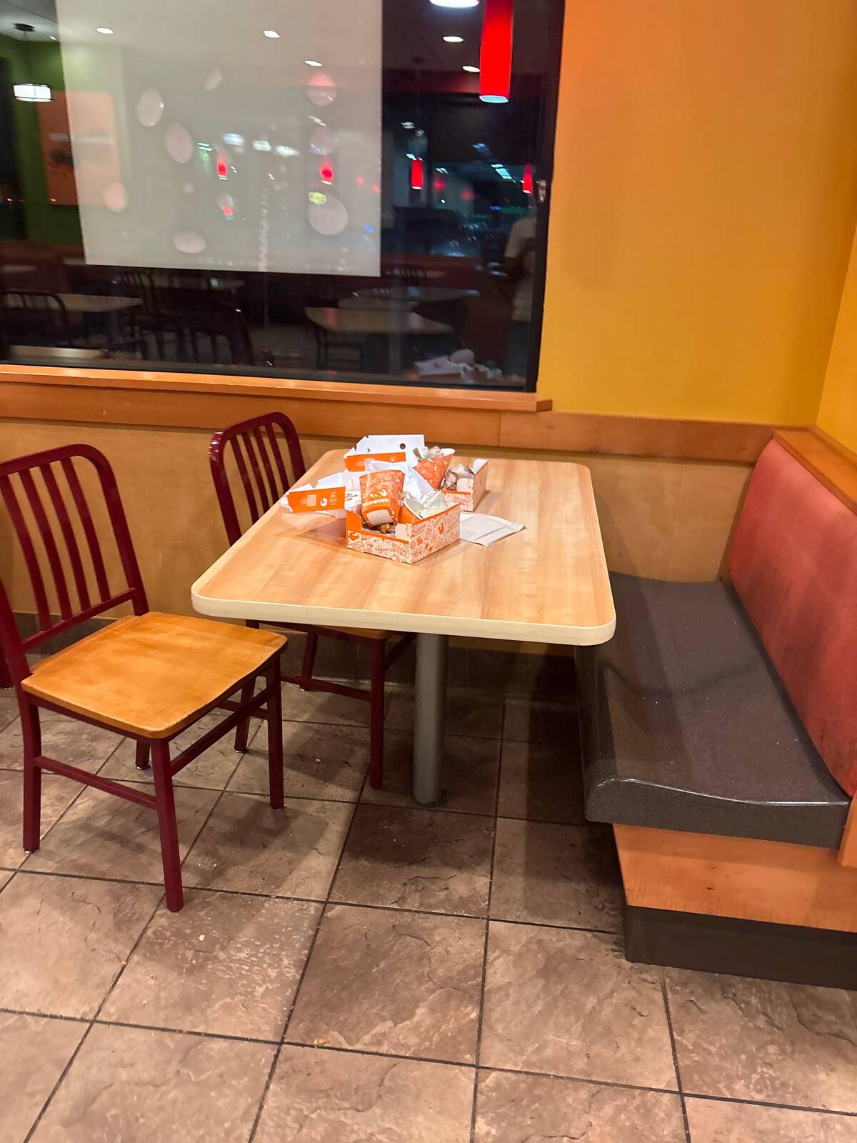 Wow, someone really just finished their meal and dipped out like cleanup was optional. Did they think the table would just clean itself, or did they genuinely forget how trash cans work? Guess the next visitor gets a side of litter with their fries. Classic fast food experience, I suppose.