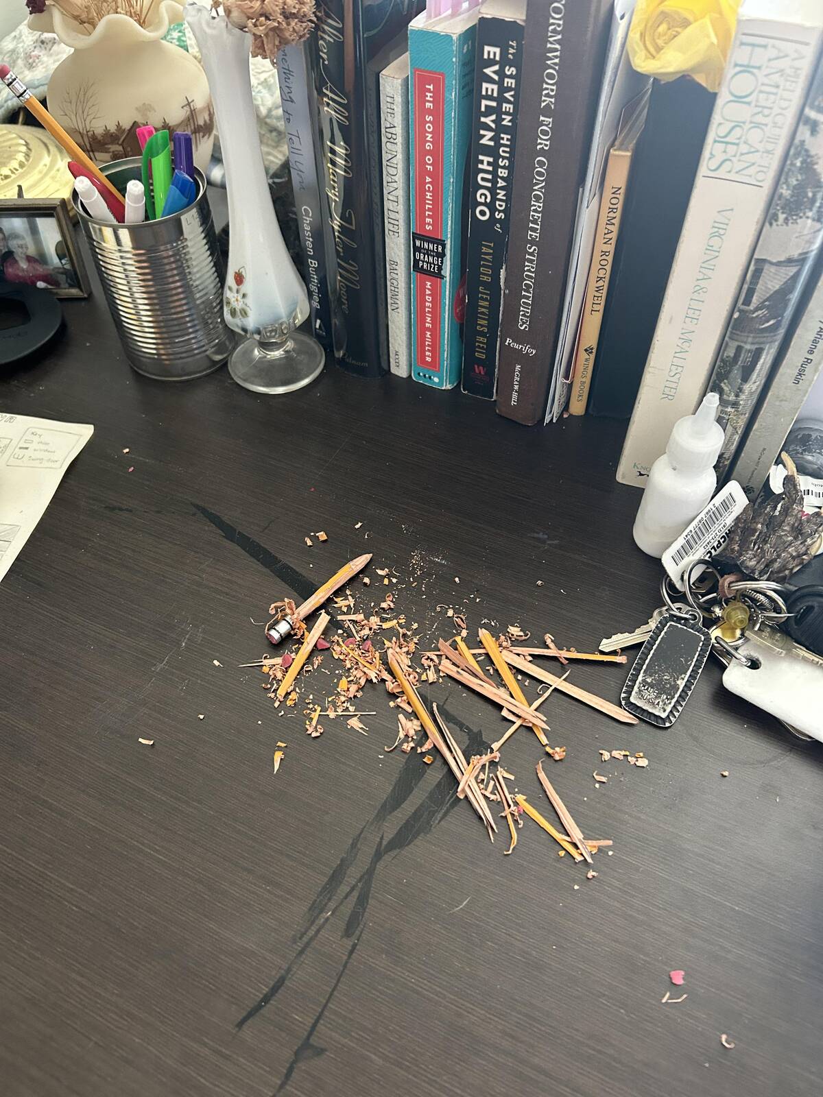 Ah yes, nothing like finding a medley of pencil carnage left for you to discover. So glad my friend decided to embrace their inner beaver on my desk. It’s the chaos—and the absolute zero attempt to tidy up—that really ties the whole look together.