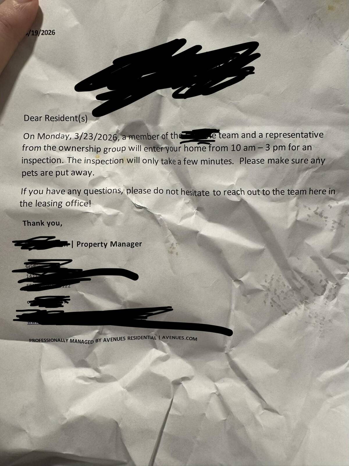 Oh, great, another inspection notice—crumpled for maximum dramatic effect. Always love a reminder that privacy is a myth and curiosity is mandatory. Next time, just leave some popcorn for the property manager’s ‘tour’.