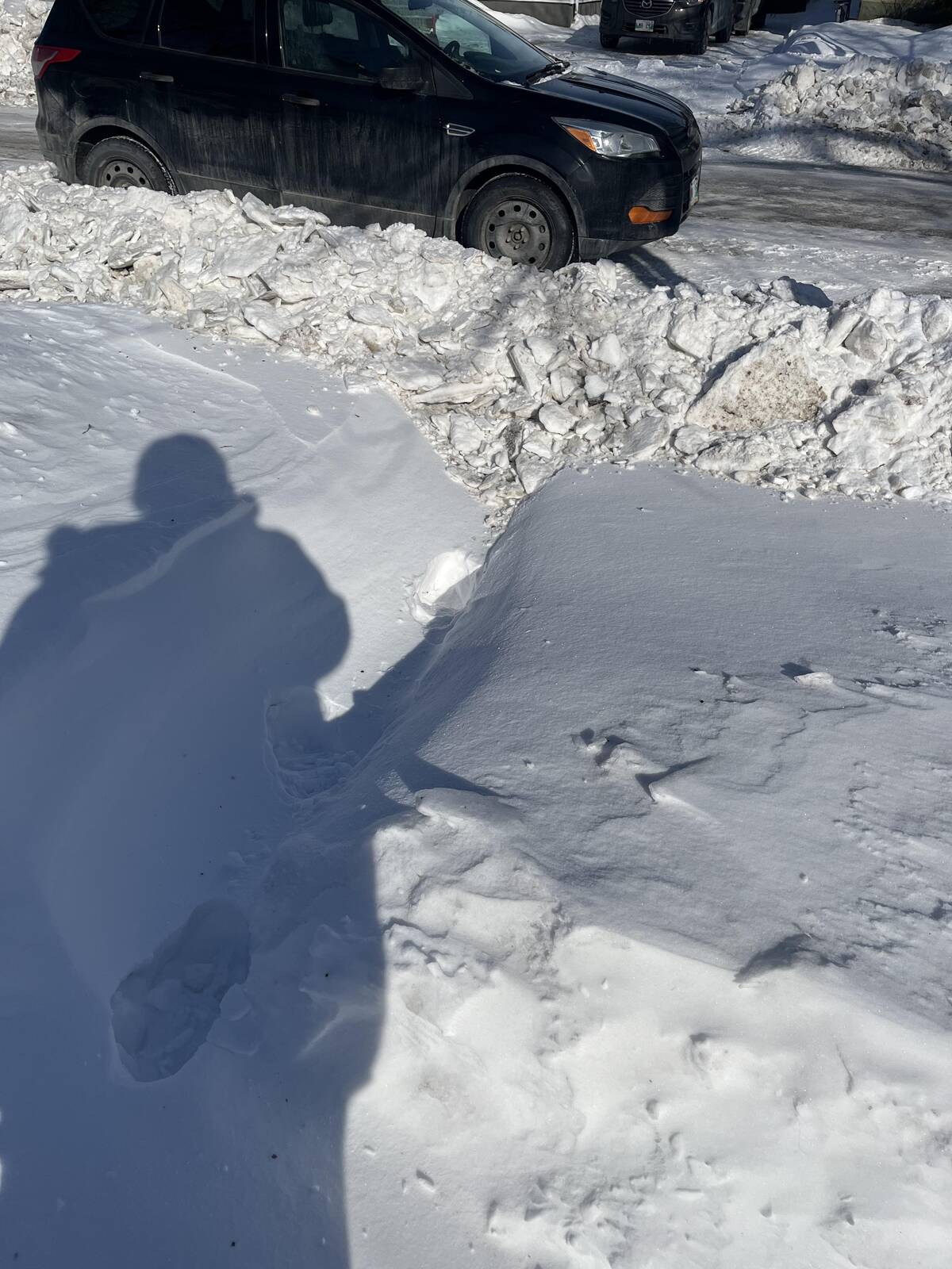The sidewalk is somewhere under that freshly plowed mountain… maybe. Why is it always the city’s idea to cover access instead of clear it? Trudging through waist-high snow—because a simple walkway just felt too basic this year.