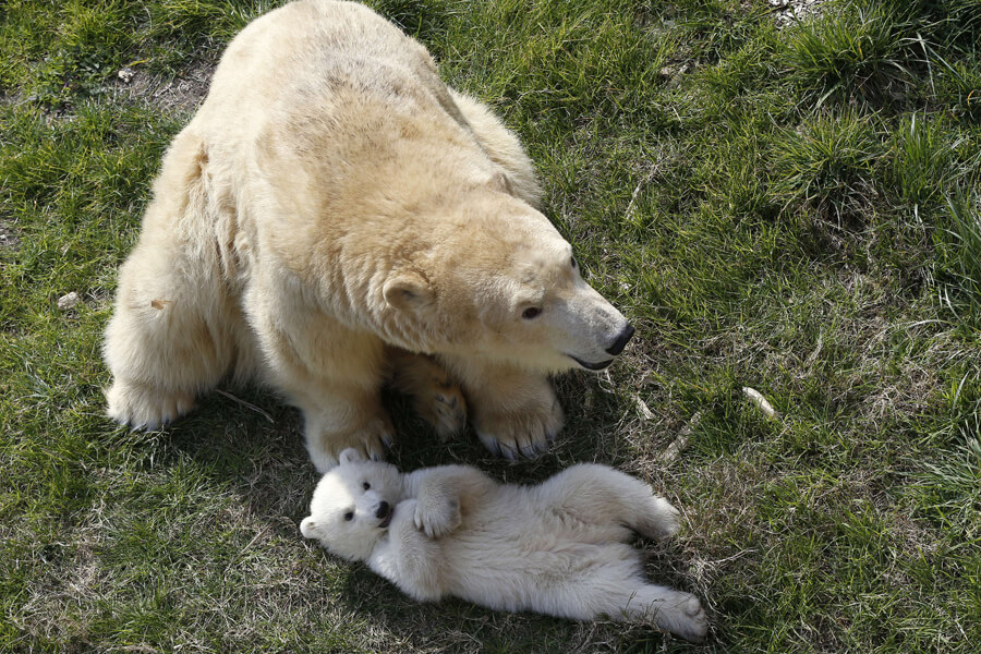 This polar bear mother keeps a watchful eye on her cub at the Marineland Animal Exhibition Park in Antibes, France. The park plays a significant role in helping to increase the polar bear population.