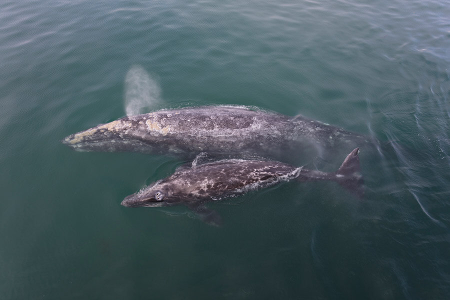 Tourists near the California coast were thrilled when a gray whale mother and her calf came close to visit. The curious whales swam right up to the visitors, eager to check them out.