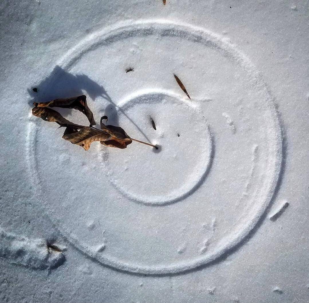 “A leaf in snow, blown by the wind, creating a circle pattern”