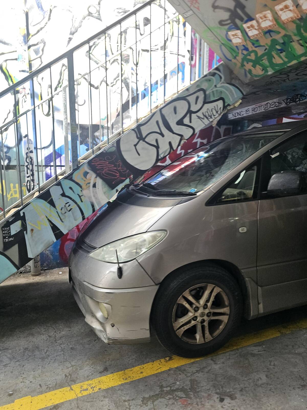 Is this the award for ‘most reckless parking job,’ or did the stairs just sneak up on this car? Either way, that’s a parking spot with character, if not convenience.