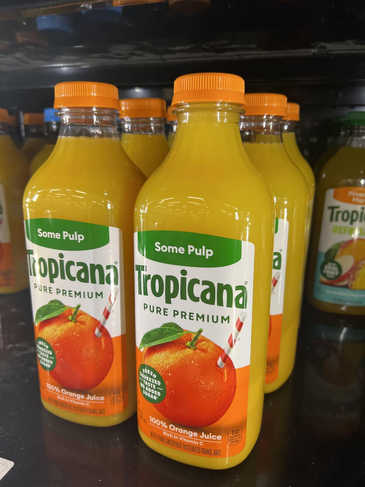 One of these bottles is clearly the overachiever in the fridge. Totally full, not an air bubble in sight. The other OJs look on in awe, wishing they could measure up to its maximum juice ambition.