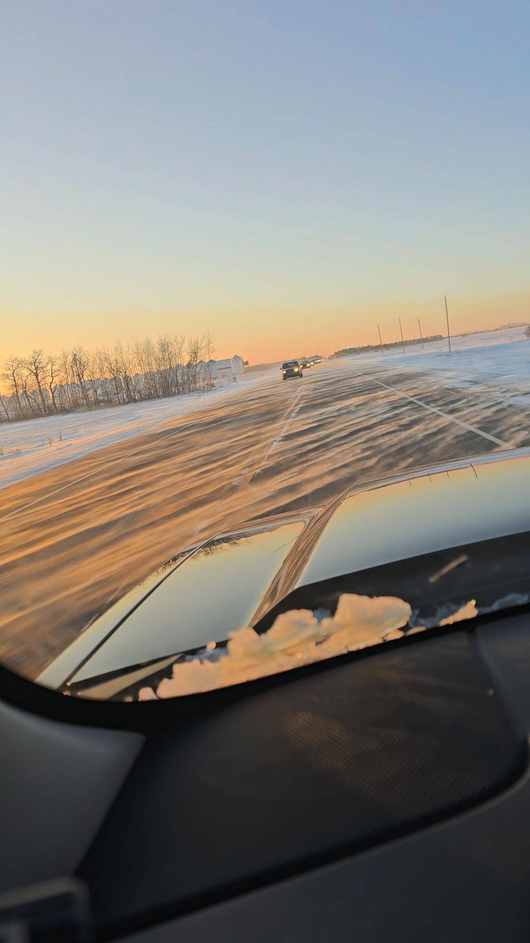 “Snow blowing across Canadian prairie highway.”