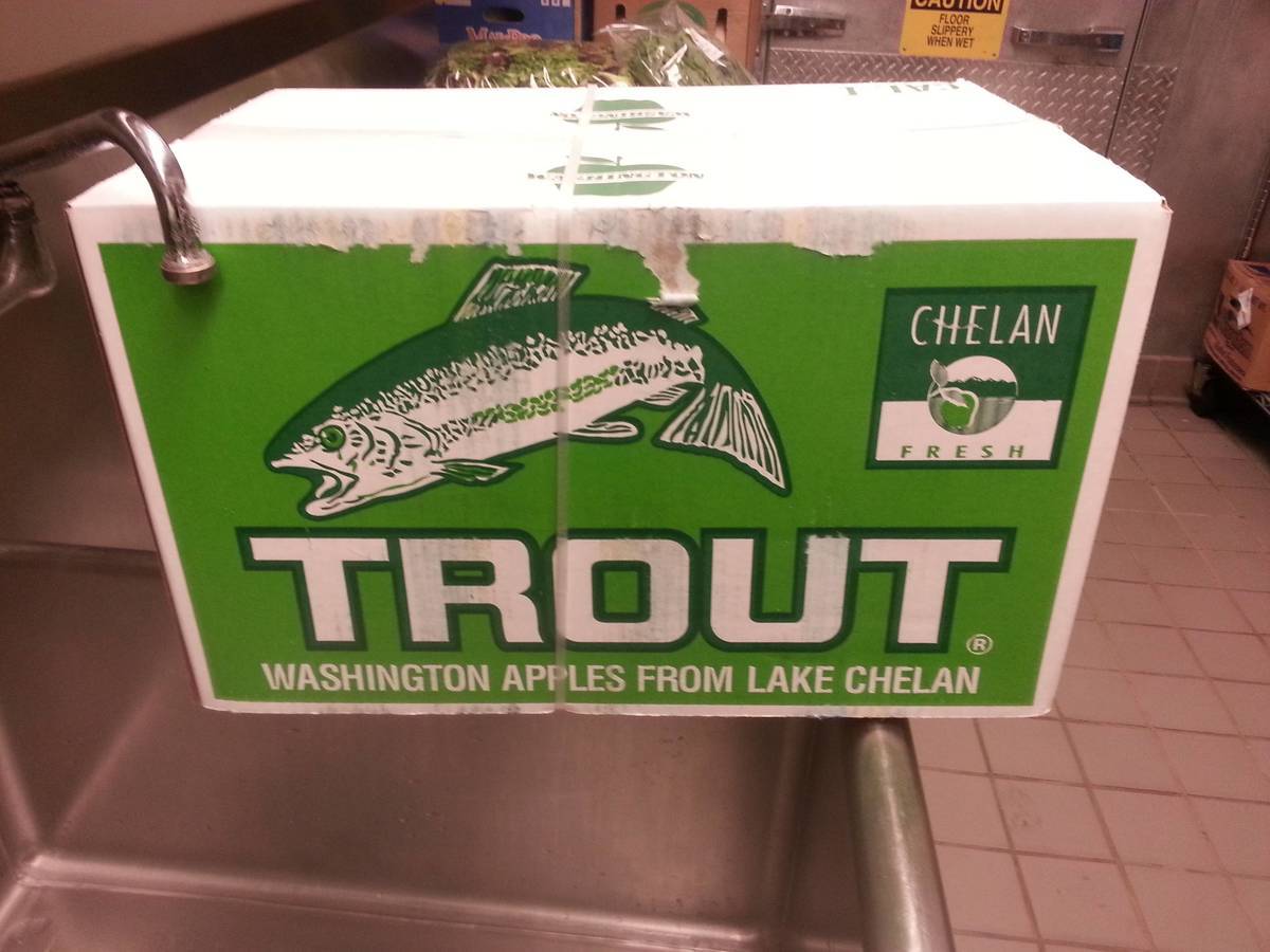 Talk about confusing. This large box of “trout” that is labeled “fresh” features a picture of an open-mouthed trout on the side, but it’s not really a box of fish.