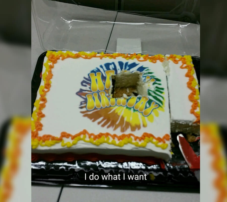 This person took it to the next level by ruining the cake their coworkers gave them—cutting out a middle slice and effectively sabotaging how the rest of the office could slice it. Nicely played.