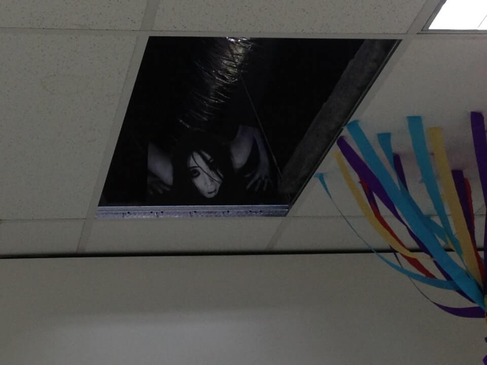 A co-worker decided that putting this creepy picture in the ceiling was a good idea, and it absolutely wasn’t.