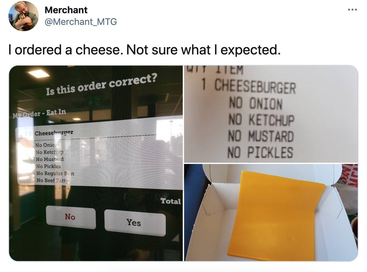 The thing that really gets me about this is that that person probably paid for a cheeseburger and ended up with only the cheese. I respect it, but it seems like they could have gone and bought a package of sliced cheese for the same price.
