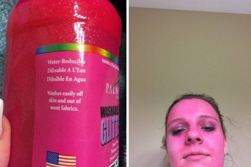 It should have washed off her skin like it said on the bottle, but this is a little bit on her, too, because why would you put pink temporary dye all over your face?