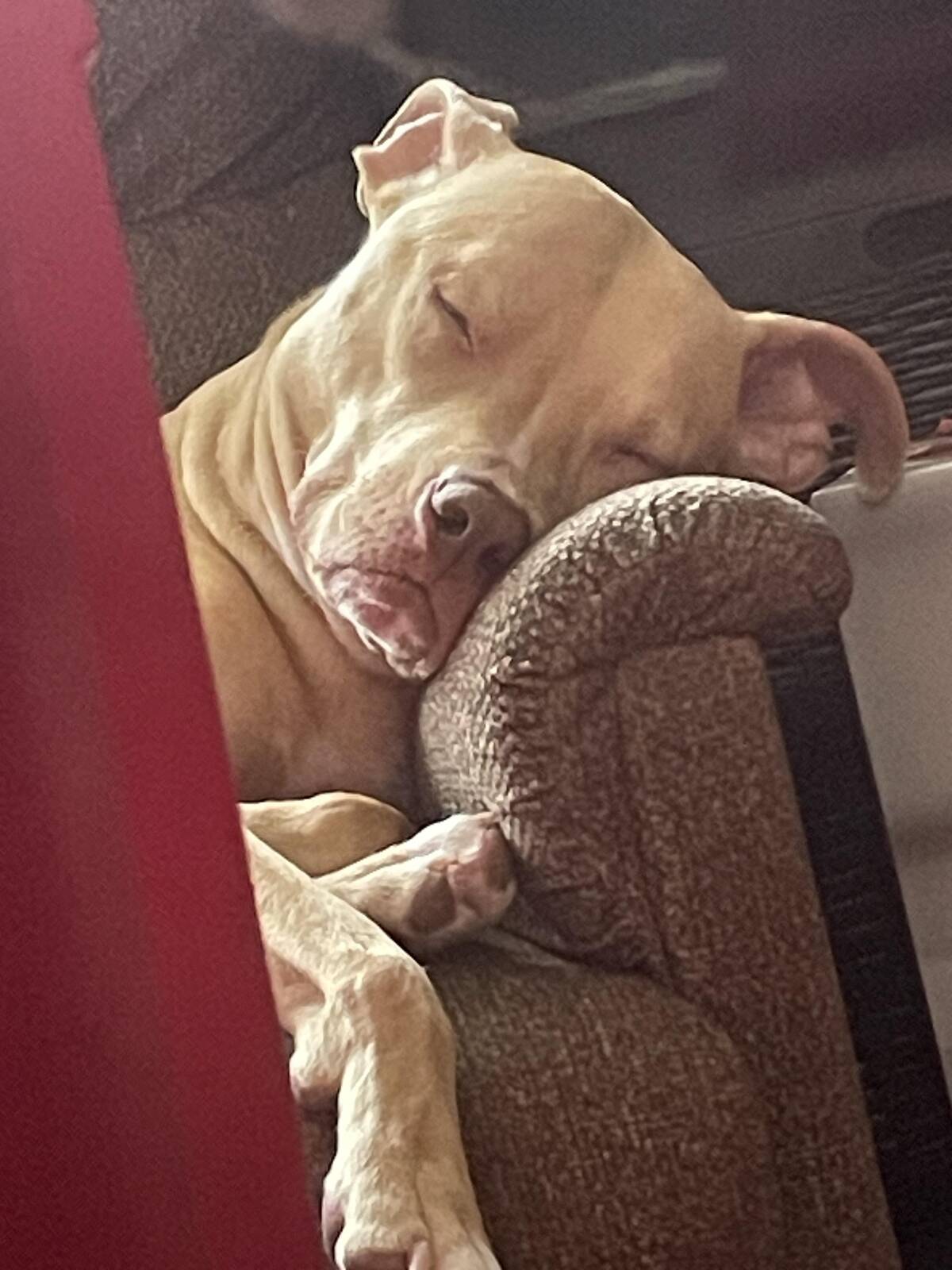 Cozy couch, sleepy face—someone is deep into dreamland and living their best life. It’s truly impressive how dogs can make even the weirdest napping positions look comfortable. Sweetest dreams incoming!