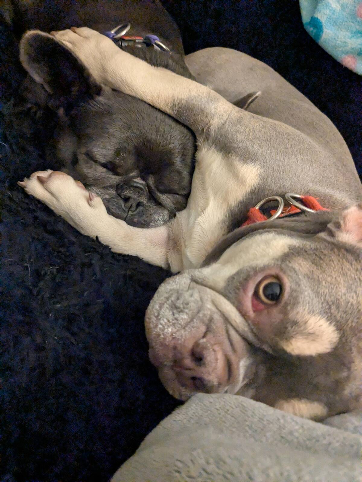 The way these two pups are snuggled together deserves a gold medal in synchronized napping! One’s in dreamland, the other’s wide-eyed and plotting the next adventure. It’s peak canine companionship.