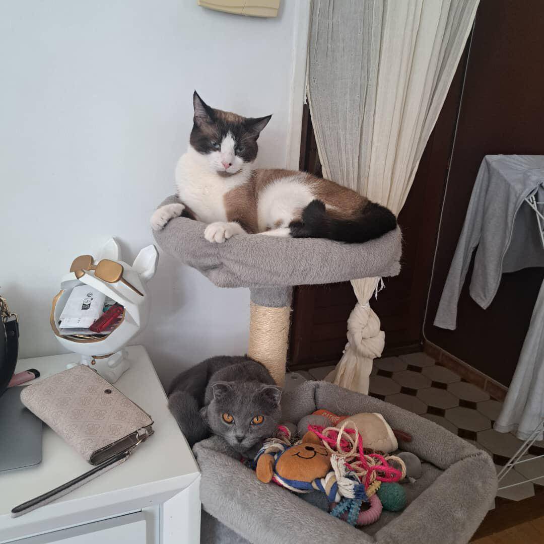 Two cats, one tower—double the attitude, double the cute! Love how each one has claimed their own perch like royalty. Would love to see what the upstairs-downstairs dynamic is here. Looks like the lower level is for serious business (aka toys).