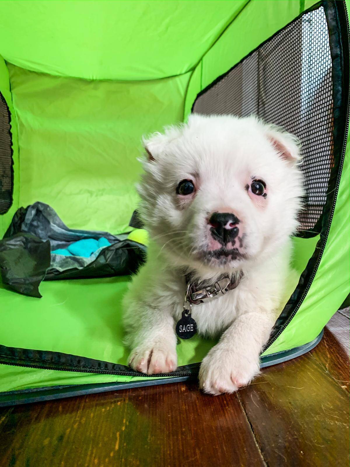 Look at that sweet puppy face! The name tag is adorable, and the setup says ‘pampered and loved.’ It’s impossible not to heap affection onto this little one. Definitely the sort of companion to brighten your whole day, if not your entire week!