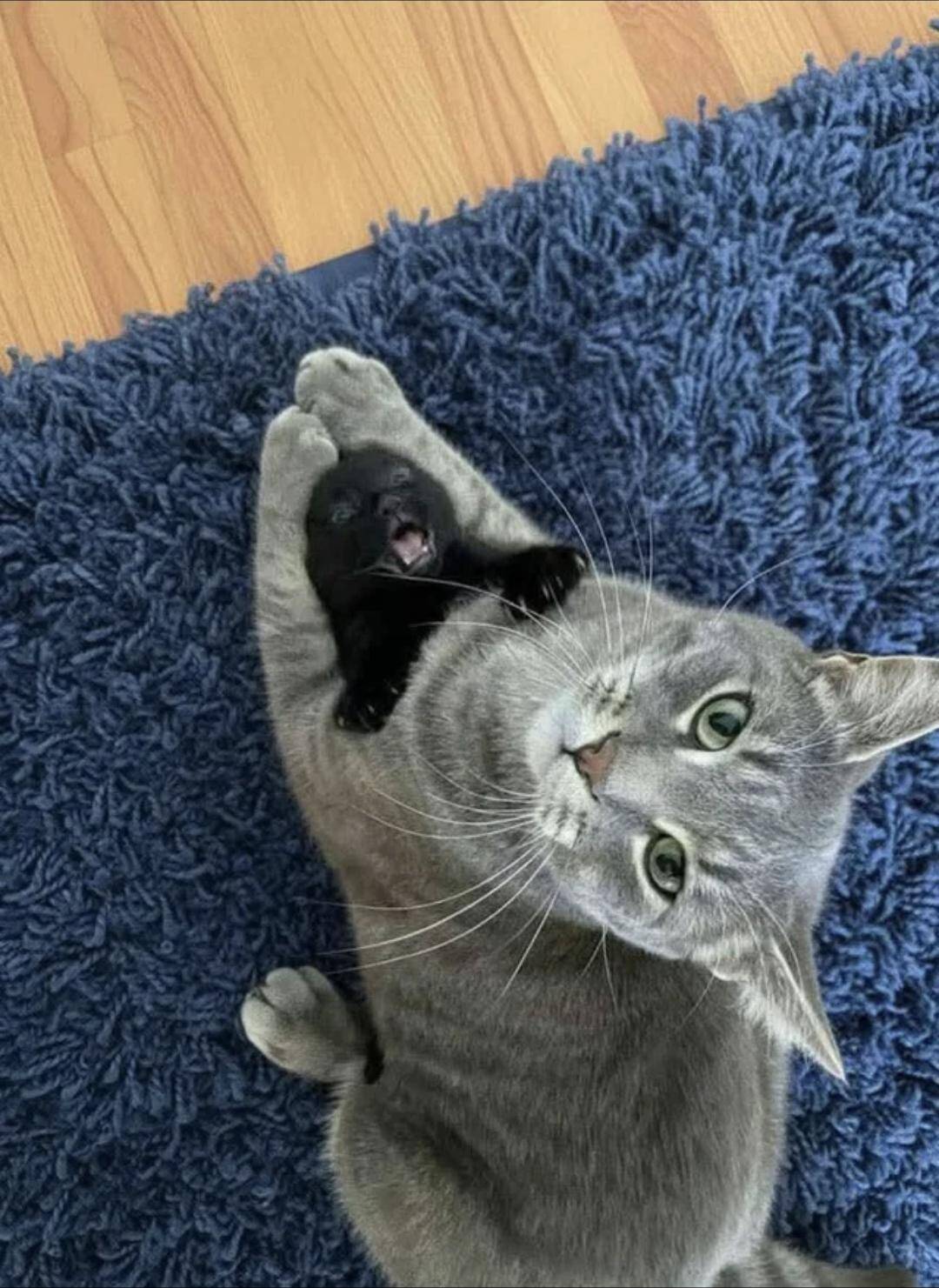 That little kitten’s face says it all; someone is not thrilled about mandatory cuddles. The older cat looks like they’re just doing their best! This duo brings some serious sibling energy. One’s ready for naptime, the other for shenanigans—a classic clash we all know and love.