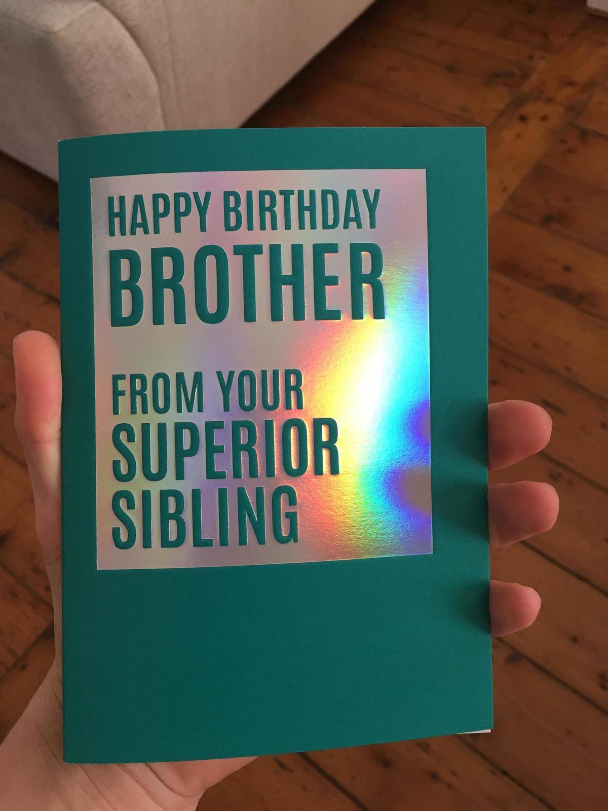 This shiny birthday card says “from your superior sibling” which seems like the opening scene to a villain origin story.