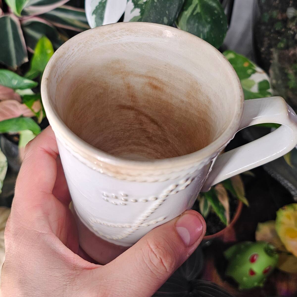 How did my mug pick up the outer pattern on the inside? Either that’s hardcore tea stains, or my cup’s running some kind of secret design society.