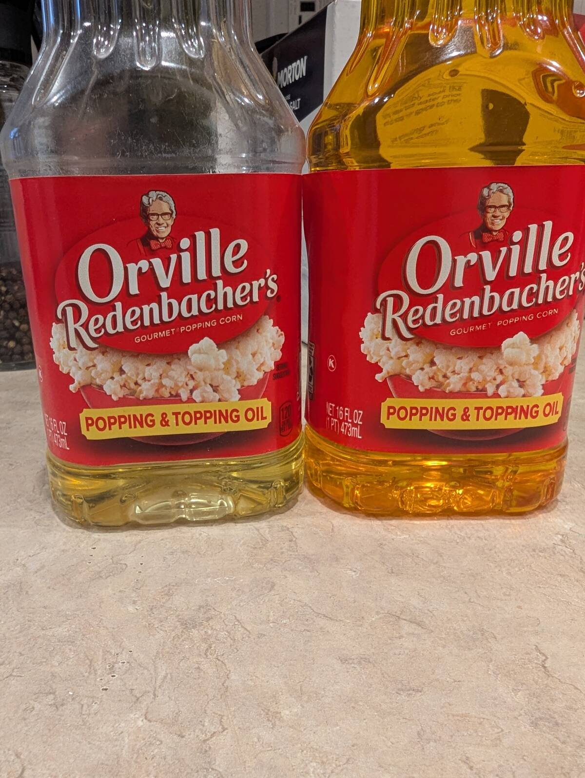Popcorn oil, old vs new. One’s looking a little vintage, the other is all neon and ready for movie night. Time to clean out the pantry… or just make a LOT of popcorn.