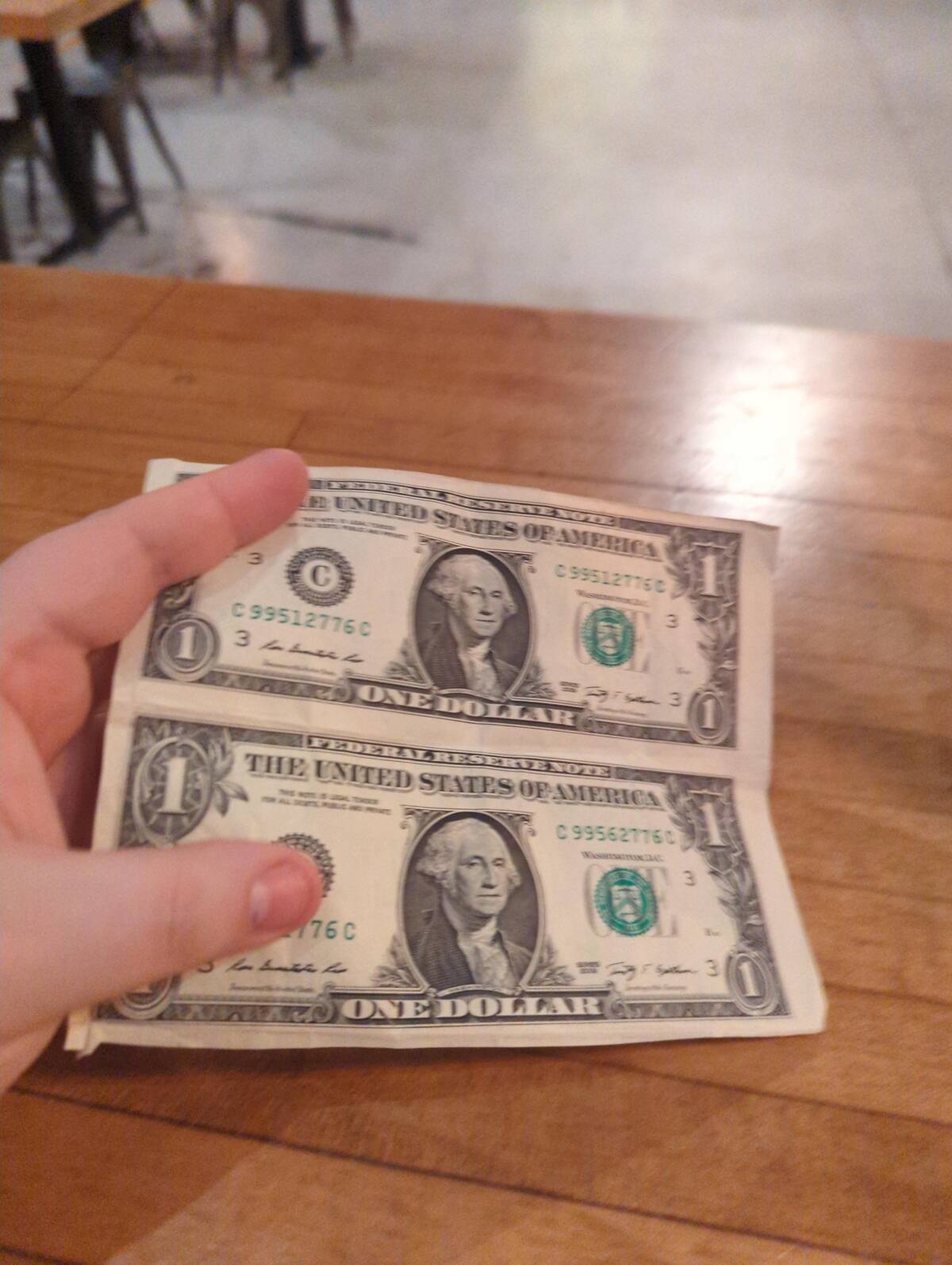 Double dollar—the rare double dollar! I’d almost hate to separate these two bills, they’re like conjoined twins of the tip jar world. Is this legal tender, or have I stumbled into money-laundering Monopoly night?