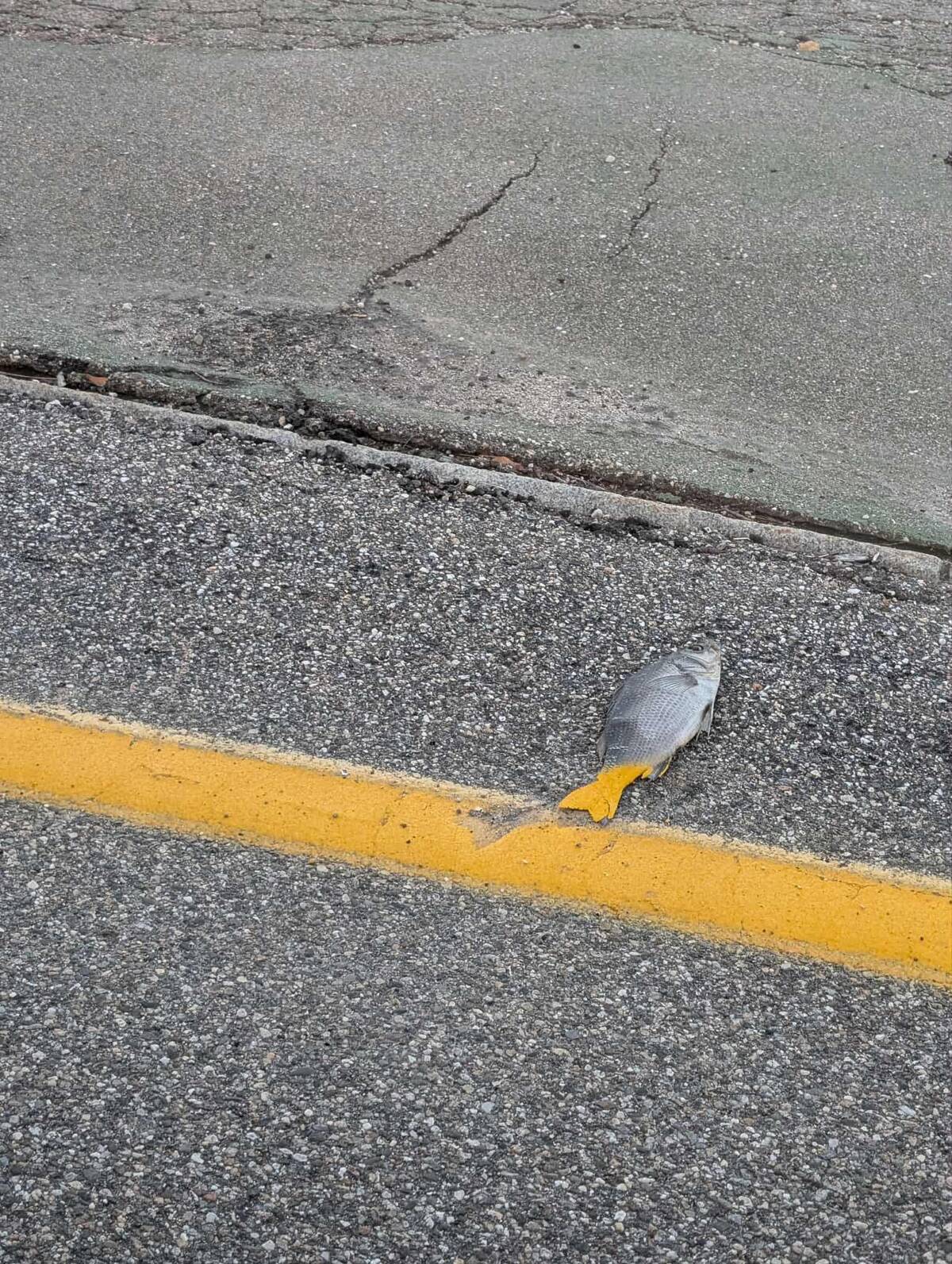 When roadkill takes a surprising turn and now you’re looking at a seafood crime scene. It’s a fish-out-of-water story in the literal sense—and somehow even the paint line got involved.