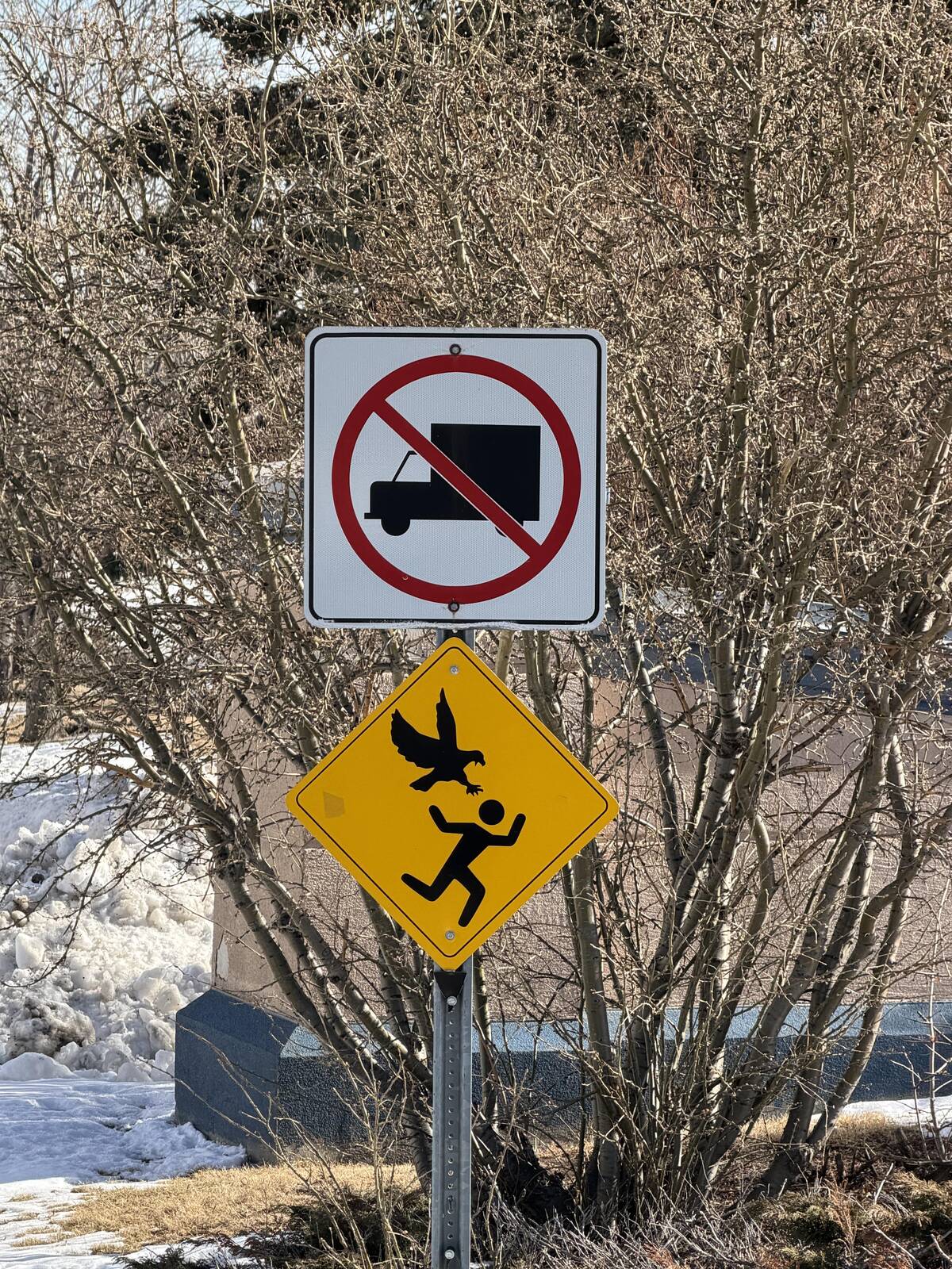 No trucks allowed, but if you’re on foot, keep an eye out for angry birds. The sign placement here tells a whole action movie in two images. Honestly, the mental image is better than most Saturday morning cartoons.
