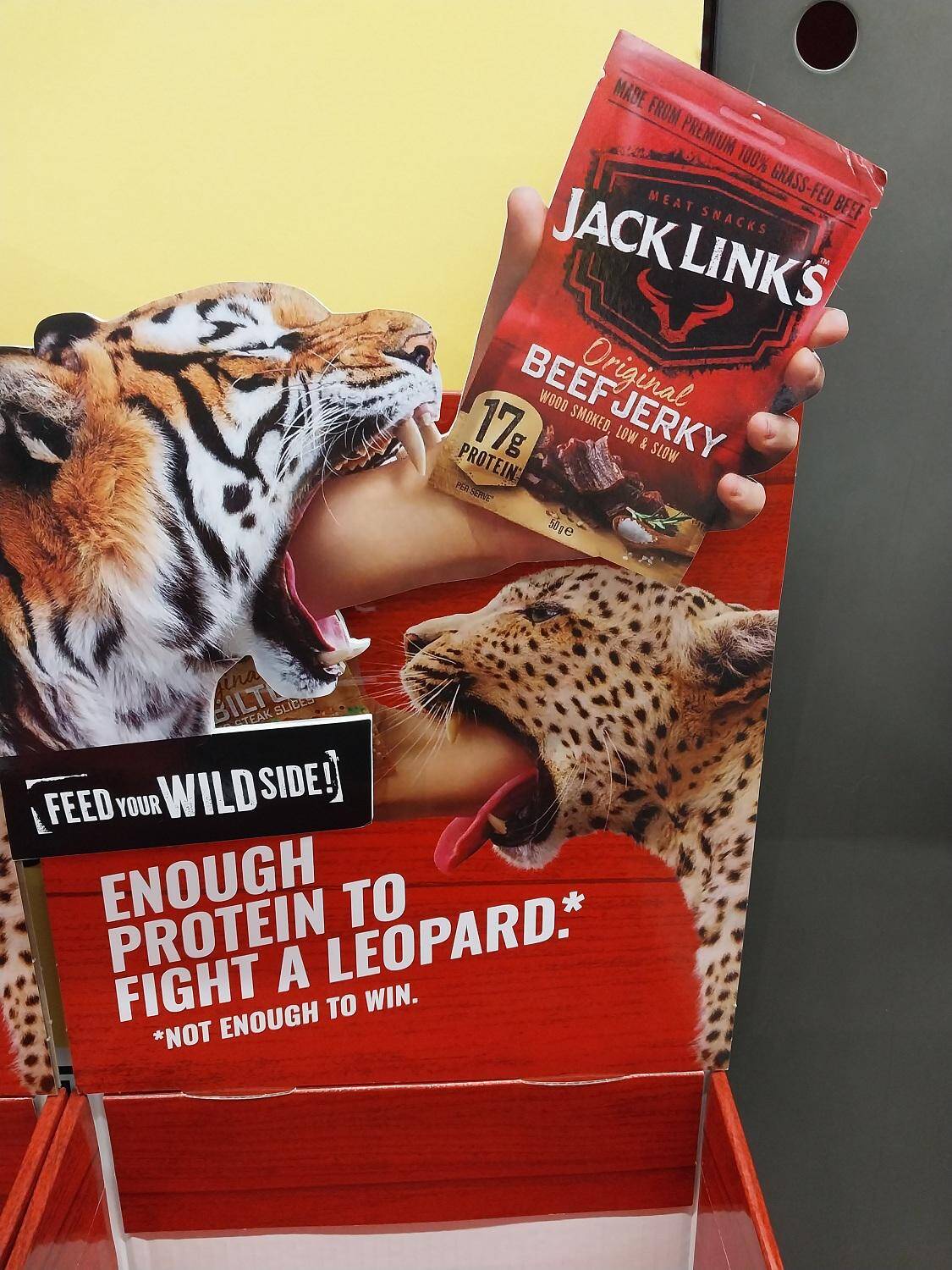 ‘Enough protein to fight a leopard—not enough to win.’ This jerky is nothing if not honest! At least they’re setting realistic expectations. Just in case you’ve ever wanted to test your post-snack battle skills against wild cats, here’s your gentle warning.