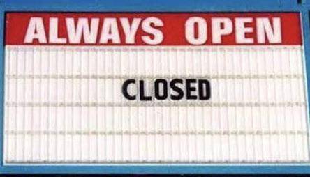 How can something be always open… and yet also closed? Is this a paradox in sign form? My brain hurts just trying to process it. Someone either has a very dry sense of humor or didn’t have enough letters to play with.