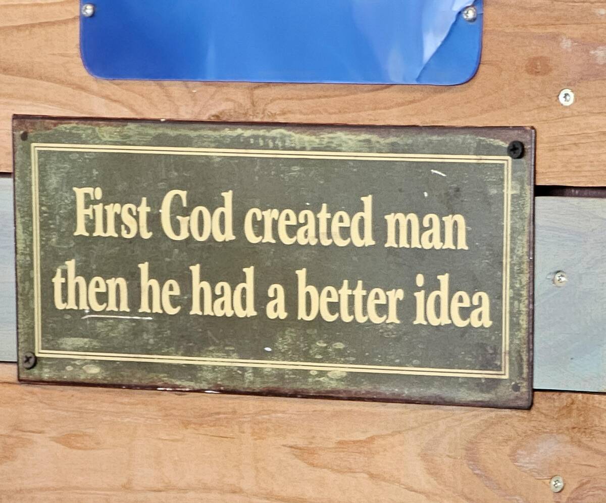 ‘First God created man… then he had a better idea.’ The sign doesn’t say it, but we all know. If only every theological debate could be settled with such a quick-witted plaque.