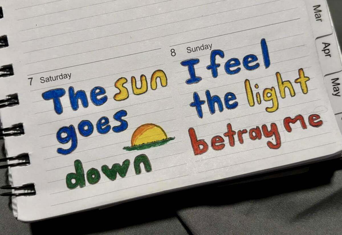 This is either the most dramatic planner entry ever or someone’s mini existential crisis in colored markers. I definitely relate to the sun going down betraying me—especially on Mondays.
